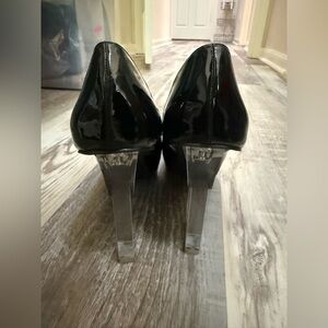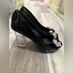 Step out in style with these elegant black peep toe heels from 2 Lips Too. Featuring a striking sequin bow, these shoes add a touch of glamour to any outfit. Perfect for any occasion.