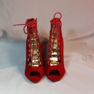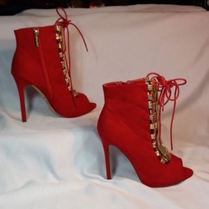 Beautiful Boss Lady Red ❤ Booties w/ Gold Leather Accents ,String Ups & Side Zippers Perfect For Any Special Occasion In Perfect Condition.