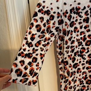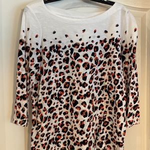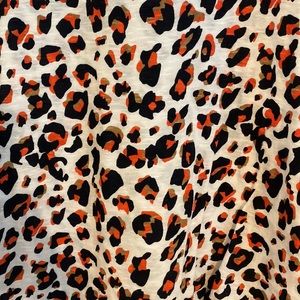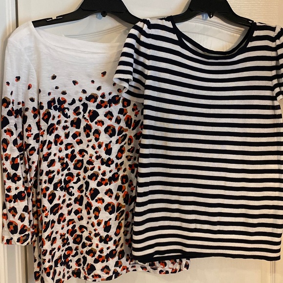 Two tops. In good condition. Leopard top blue and orange with brown. Boat style neckline. Three-quarter sleeve.