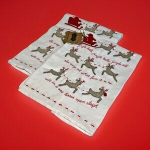 2 MUD PIE Christmas Santa's Sleigh Linen Tea Towels Embroidered Rudolph Reindeer