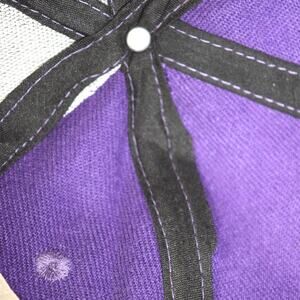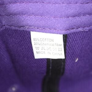 This listing is for two identical purple hats. The hats are unbranded . They are 80% cotton and 20% chemical fibers. Sequins in the front of the hat are shaped as a Fleu De Lis and also outline the brims' edge. one of the 2 hats has stitching that did not catch the edge of the bias trim on the inside of the hat. Please view the photos to see the condition details.