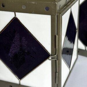 These are by Majolein Bastin a stained glass candle lantern. They feature a metal frame with white and lilac stained glass panels. each with etched floral designs.These lanterns are designed to hold tea light or votive candles and add a decorative touch to indoor or outdoor spaces.