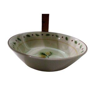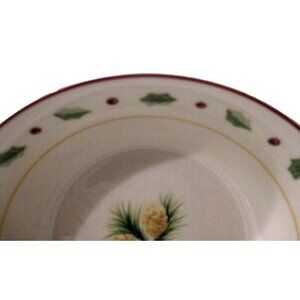Add a touch of nature to your table setting with these beautifully designed Merry Brite ceramic bowls, featuring a pinecone and holly pattern. Ideal for everyday use.