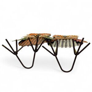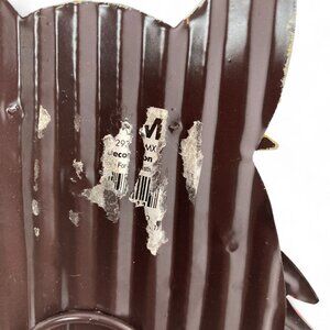2 Metal Owl Standing Figurines, Colorful Cheerful Corrugated lightweight metal, orange, gray, green, gold Autumn Fall theme - sunflower eyes, hay under beak, wings shaped like oak leaves Free standing, approximately 8 inches tall Remnant of label on back, brand not legible Excellent condition