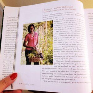 This book blends the first lady's personal gardening experiences with stories from the White House Kitchen Garden. It is divided into 4 sections (one for each season) and includes color photographs of vegetables, as well as recipes, instructions for making a compost bin, and stories about US community gardens. There is an inscription from the original owner on the first leaf.