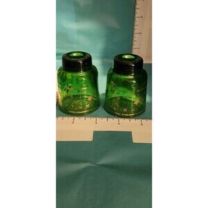 Set of two vintage mid-century shot glasses made of beautiful emerald-green glass with elegant gold decorative detailing. These retro barware pieces bring instant charm and sophistication to any collection or home bar setup.