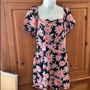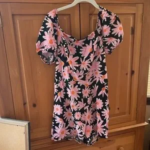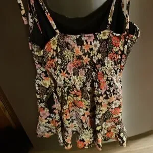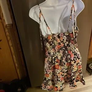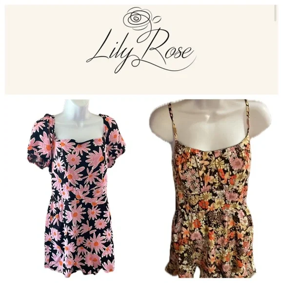 Both are size medium (juniors) in excellent condition! Like brand new! Adorable and fit to size. 1st: 100% Polyester & 2nd Self: 100% Rayon & Lining: 100% Polyester. 1st is navy with large pink flowers and orange centers. The design is on the front, side pockets, back and crossing straps on the back. 2nd: The print is a multi-color floral. It is black with many different styles, shapes, and sizes of flowers. Some are yellow, orange, white, and lilac. Some of the centers are tan but others are orange or yellow. The pattern continues on the back and the straps. It is a sleeveless romper with spaghetti straps. It also has side pockets. It is perfect for the summer, warm climates, vacation, dates, casual days, and more. I will list as a bundle and single listings. Bundles of any 2 or more items are 30% off in my closet. Mix or match the categories. Message me with any questions. I am open to offers.