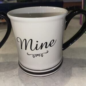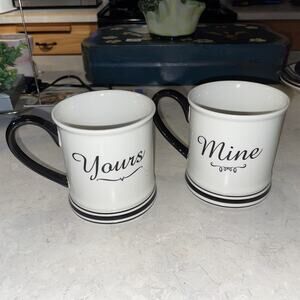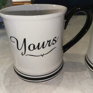 The product is a set of two novelty coffee mugs from FORMATION BRANDS, featuring the designs "Yours" and "Mine". The mugs are ceramic and come in black and white colors. Each mug holds 16 oz of coffee and is perfect for adding a bit of personality to your morning routine. New no tags