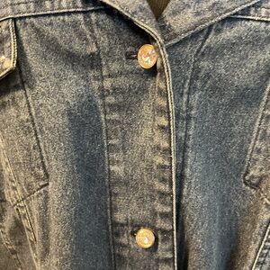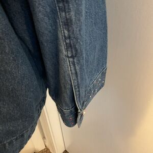 Denim jacket with rhinestone collar and cuffs, featuring a mix of blue and red hues #denimjacket