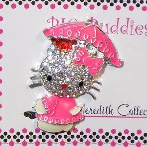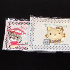 Both are new with $20 tags. Because of the very strong double magnets, they make great magnetic brooches & fridge magnets as well as sewing needle minders. Although fabric stores & other online platforms sell these as Hello Kitty, none of them are stamped "Sanrio". The pink kitty with umbrella is 1-5/8 by 1-1/4". The cream enamel 1-1/4" kitty has rhinestones with a Rainbow finish, so they sparkle & change colors with light & movement.
