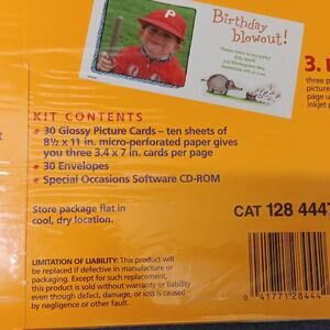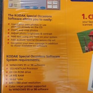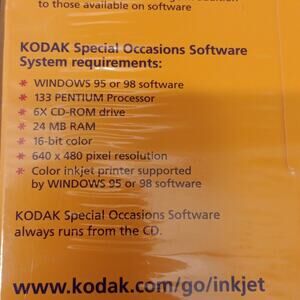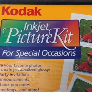 Vintage 2 New wrapped in cellophane Kodak Inkjet Picture Kits for Special Occasions. Each pack contains 10 sheets of 3 glossy cards (30 cards each pack/60 cards total). Each card measures 3.4" x 7". Kit includes: Sheets of cards, 30 envelopes, special occasions cd-rom that contains over 600 pieces of clip-art, frames and borders and allows you to insert your own photos/art. CD-Rom is outdated so please verify your system against system requirements. Systems requirements: Windows 95 or 98, 133 Pentium Processor, 6X CD-Rom Drive, 16-Bit color, 640x480 pixel resolution, color inkjet supported by windows 95 or 98.