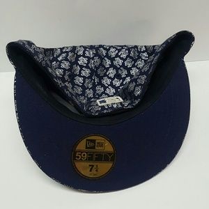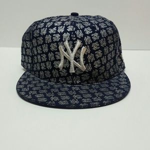 Blue NY Yankees Hat with a silver metallic NY Yankees Pattern (great condition) and a white NY Yankees Hat with Gold Embroidery (barely worn but shows sign of discoloration, it's not bad though)