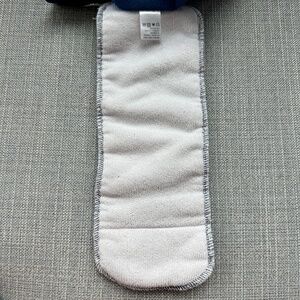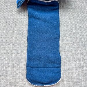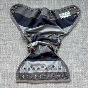 The Nicki's Diapers All-in-Two Diaper has an adjustable rise and will fit from approx. 8-35+ pounds. It has a soft lined cover and a snap-in padded absorbent layer insert. You can switch out the insert for a different product, or keep the ease of a matching set. The outside pattern features wide blue stripes with dark blue snaps and trim. The interior is dark blue.