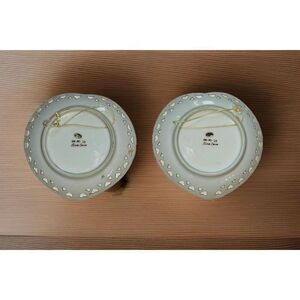 This is a set of two Norcrest Japan porcelain dishes with a heart shape and a delicate heart pattern cut out around the edge. The dishes are hanging and have one compartment. They can also be used as non-hanging trinket dishes. They were made in Japan and have a painted backstamp. The material is porcelain and the color is white with a beautiful hand painted pine cone design and gold trim. The dishes are vintage and measure 6in across and about 6 in long.