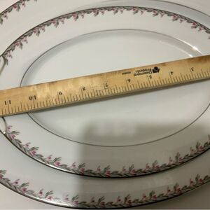Noritake 5507 Petite Pattern 16.5” & 12” Oval Serving Platter Pink Sage Silver and one salad plate 8.25”
