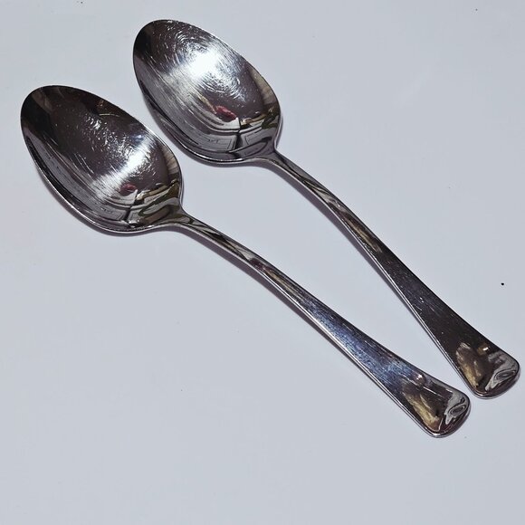 2 Oneida Distinction Serving Spoons 8" stainless glossy 2000s vtg MCM