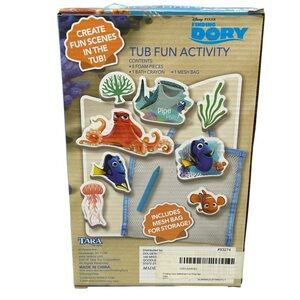 Make bath time extra fun with this 2-pack Disney Pixar Finding Dory Tub Fun Activity Set! Each set includes 8 colorful foam pieces, 1 bath crayon, and 1 mesh storage bag — perfect for creating underwater scenes right in the tub. Kids can draw on the tub walls, stick foam characters, and enjoy creative water play with their favorite Dory, Nemo, and friends.