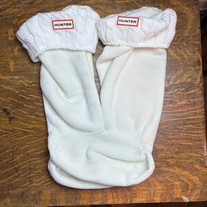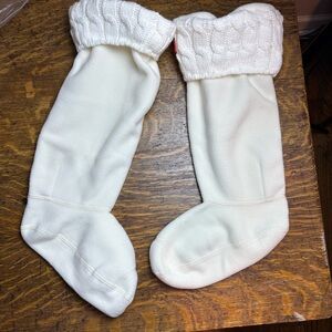 This listing is for 2 pair of Hunter cream cable-knit boot socks. 1 pair new, 1 pair used. Photos 1-6 show the new pair, size MEDIUM. Box is opened. Photos 7-10 show the used pair, size LARGE. See pink stain on heel. Please note the two different sizes and check the sizing chart. I wear a size 10, and my big toe touches the end of the medium sock, but it’s not tight. Selling as two pair, not splitting them up.
