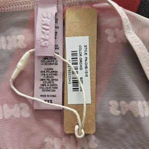 So pretty and comfortable. Bikini cut, with logo embossed all over. The color is Orchid, size xxs. Fabric is polymide with cotton lined gusset.