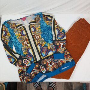 Women's 2 pc outfit top is sunny leigh size small, multi colored, and the bottoms are old navy corduroy has 4 buttons on it, straight leg, size 4, stretchy, both in great condition and comes from a smoke free home. Check out my other items for a bundle deal and save!