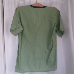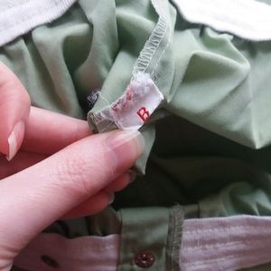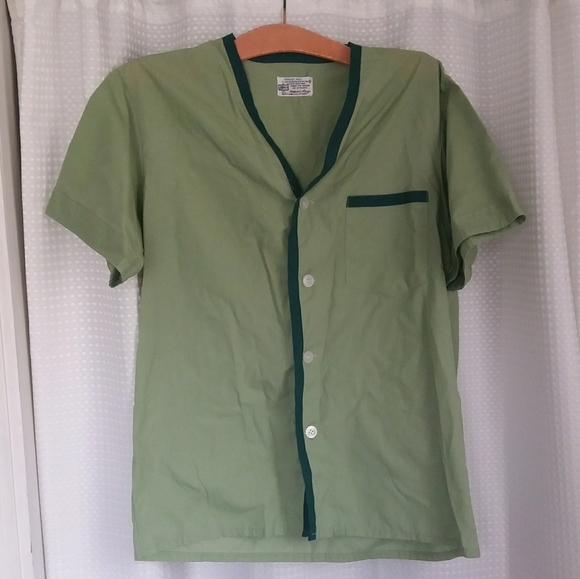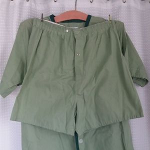 Adorable and comfy light green short sleeve button up shirt and boxer style short pajama set. Cute darker green trim on top. Snap fly. Tag says K Mart, machine wash, tumble dry medium, 65% polyester, 35% cotton. Unisex.