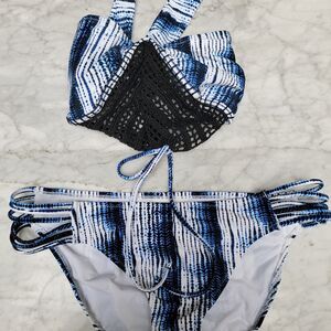 Crochet lace yoke top halter bikini and side open string bikini bottom Large