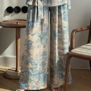 2 PIECE WARM BLUE AND CREAM TOILE PRINT BUTTON DOWN FRONT TROUSERS AND TOP SET