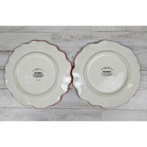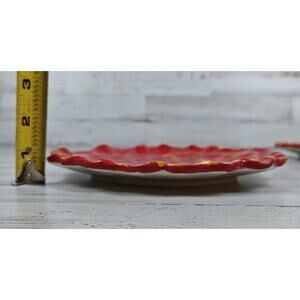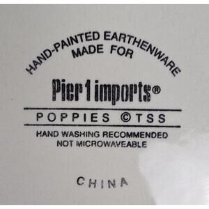 These Pier 1 Imports 8" Red Flower Salad Plates are hand-painted earthenware pieces featuring a poppy flower pattern in a vibrant red color. Made in China, this two-piece set is perfect for occasions like Easter, Mother's Day, anniversary, and all occasions. Hand wash only, these glossy finished plates are ideal for serving salads, desserts, cheese, and bread, adding a touch of floral decor to your dining table. With their unique design and handmade quality, these plates are a great addition to your collection from the Pier 1 Imports Poppies product line.