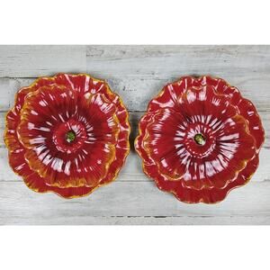2 - PIER 1 IMPORTS Poppies 8” Red Flower Salad Plates Hand Painted Earthenware