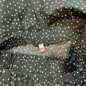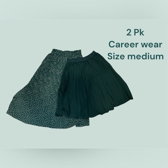 This is a 2 pack of shin length skirts one is new with tags. Solid green skirt is by Kate Kasin size medium and is new with tags, green skirt with white polka dots is by Exlura and was gently worn. Both are the perfect addition to any career girls closet.