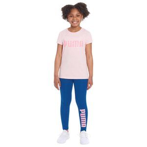 Blue legging with elastic waistband and pink PUMA cat logo on left leg