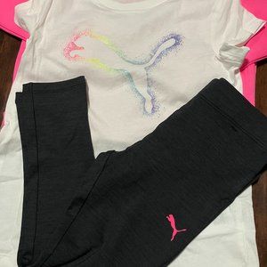 Black legging with elastic waistband and pink PUMA cat logo on left leg