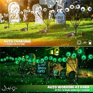 Solar Powered and Auto On/Off: These Halloween solar eyeball lights charge 6-8 hours of sunlight and provide 8-10 hours of illumination at night. Equipped with a light sensor, they auto turn on at dusk and off at dawn