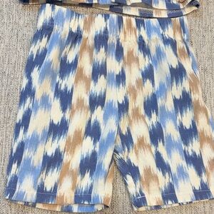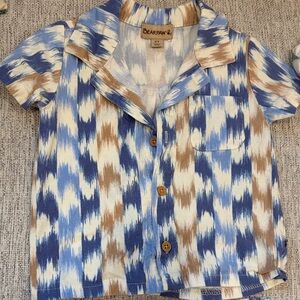 Stylish kids' shirt with a blue and brown pattern. Features short sleeves and button-up front. Ideal for casual wear.