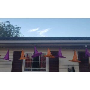 Ideal Halloween Outdoor Decoration: The perfect combination of 2 pack Halloween witch hats with warm white string lights, each is composed of eight witch hats- 4 purple and 4 orange, each hat have 7 LEDs inside. High quality polyester fabric has good light transparency, and is not easy to tear or fade. Battery box to the first hat- 2ft. First hat to last hat length- 14ft. Total length- 16ft