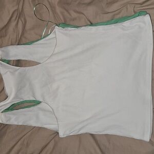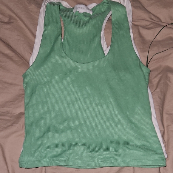 Stay stylish and comfortable with this green and cream ribbed razor back tank top. Perfect for casual outings or layering.