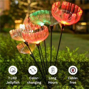 🧿【 Color-Changing Solar Garden Decor 】Crafted with a body composed of fiber optics, this 7-headed jellyfish solar garden lights gently sways in the breeze, creating a gracefully dynamic presence. As it shifts its lighting patterns, it conjures a wonderful atmosphere, adding a touch of enchantment to its surroundings, making them the perfect Christmas lights outdoor yard decorations.