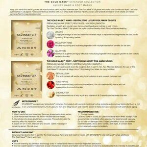 The Gold Mask foil gloves contain two layers - an inner layer soaked in a Bulgarian Rose based formula enriched with pure Shea Butter and Rose Hip Oil, and an outer protective foil layer which creates an intense warming effect to maximize absorption.