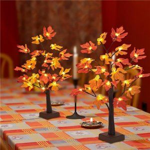 🧿Package Include: 2 Pack 24 Inch Maple Fall Tree Table Decorations. Each Lighted Maple Tree is equipped with 24 lights, 6 pumpkin shaped LED, 6 acorns and 24 maple leaves. Acorns and Pumpkin shaped LED hanging on the branches make the small maple trees full of life, bring a stronger Thanksgiving atmosphere and fall scene to your home.