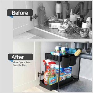 🧿Organize Sink Space- This under sink organizer with a sliding bottom drawer slides easily for easy access to items at the bottom. Upgraded bottom-to-top storage size, can hold up to 11 inches of items for regular daily cleaning supply bottles. Fits most under-sink cabinets and makes efficient use of vertical space for cleaning supplies, keeping your items organized and in order and maximizing space savings.