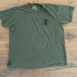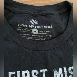 Comfortable olive green t-shirt with a stylish patriotic graphic design. Perfect for casual wear. And a Black and white Lion Graphic “I love my Freedom” T shirt. Two pack. Both shirts are XL.