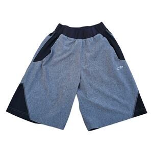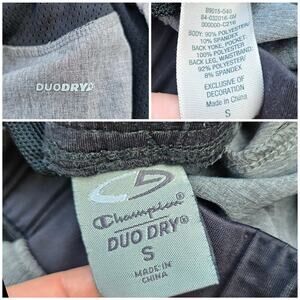 1 pair Champion gym workout shorts, gray stretch fabric w/ black mesh accents, pull on style, stretch waist with drawstring, 2 side pockets, unlined. Good preowned condition. Size Small.