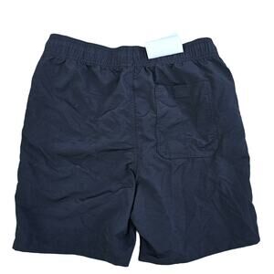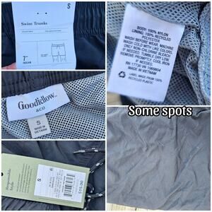 1 pair Swim trunks by Goodfellow & Co, black w/ elastic drawstring waist, grey mesh lining, 2 side pockets, rear pocket w/ velcro. Size Small. New, with tags. Shelfwear issues noted in photos.