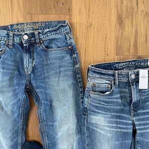 Two pair of men’s American eagle jeans, one is new with tags. The one that is new with tags is the original straight fit. It is tag size 28 x 30 but I measured the inseam and it is 29 inches, not 30 inches. we found this happened a lot with our American Eagle jeans. The new pair is cotton, polyester and spandex blend. The second pair is slim straight fit, and they are 100% cotton. I measured the inseam and it isL 28 inches even though the tag says 28 x 30. It is common for our American Eagle jeans too shorten a bit in the wash. Otherwise no noted flaws.