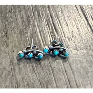 Two pairs are turquoise and silver heart-shaped and antique swirl post earrings.