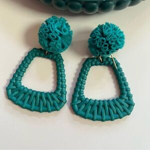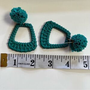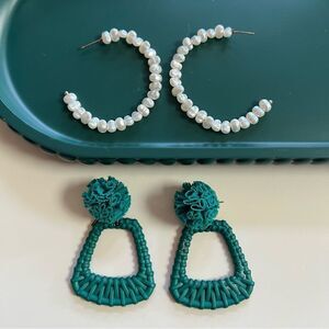2 Pairs Funky Oversized Statement Teal Wicker Pom Pom Pearl Hoop Post Earrings