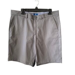 Two pairs of men’s flat front shorts waist 36. Good used condition with no stains or flaws. These men's golf shorts in gray and black are easy care, wrinkle-free material and have a hidden elastic waistband.