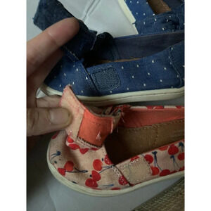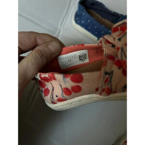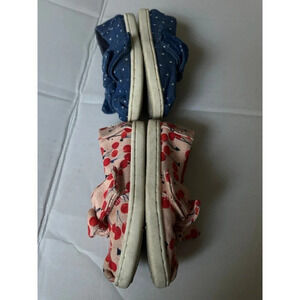 2 pairs Girls TOMS Alpargata Blue with White embroidered dots and Cherries print Slip on shoes size T6.