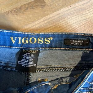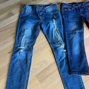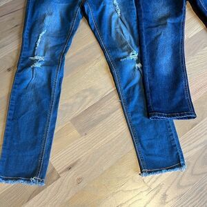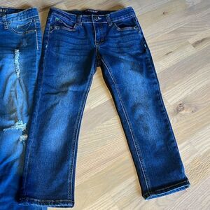One pair full length distressed, and one pair cropped. Full length pair has faux waist pockets and one back pocket; cropped pair has two waist pockets and two button back pockets.