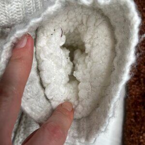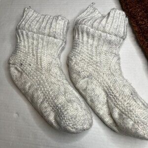 1 pair or white cable knit ankle slippers. Exterior knit design with interior sherpa.